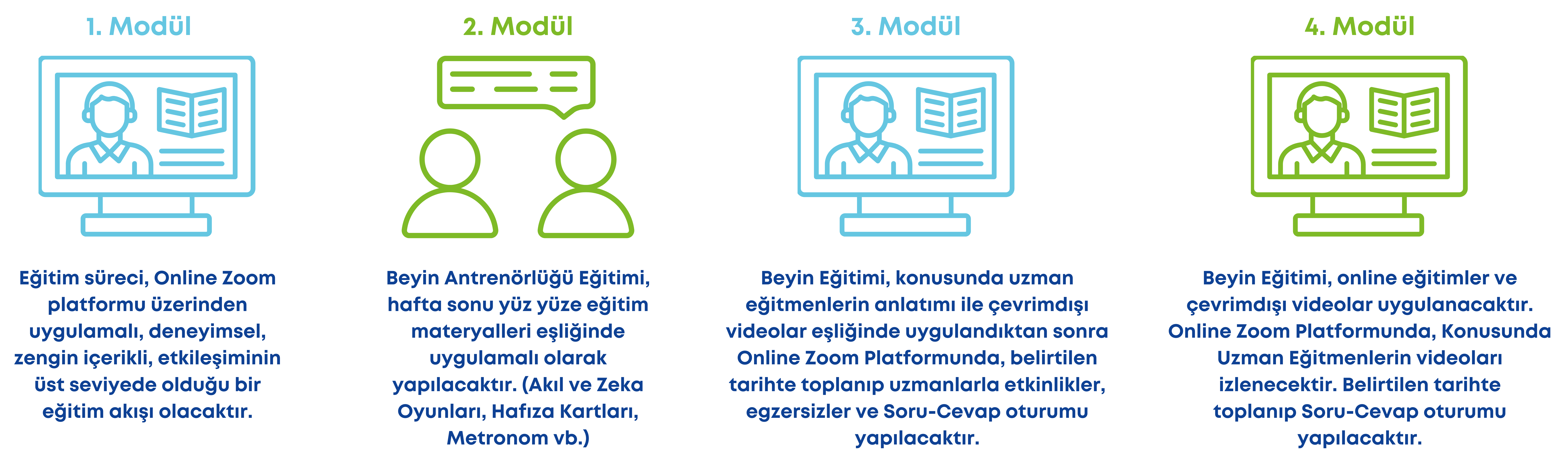 2. Seviye Beyin Antrenörlüğü Eğitimi, hafta sonu yüz yüze eğitim materyalleri eşliğinde uygulamalı olarak yapılacaktır. (Akıl ve Zeka Oyunları, Hafıza Kartları, Metronom vb.)
